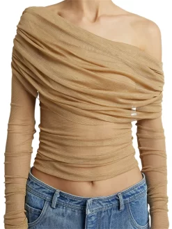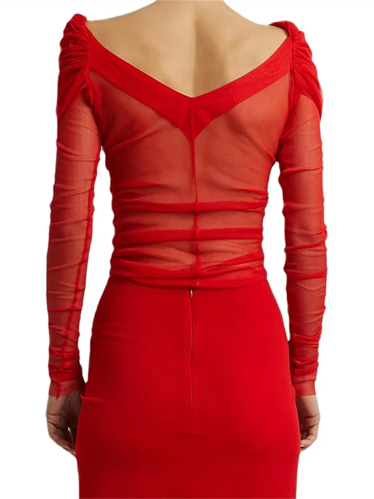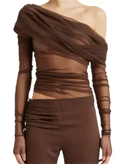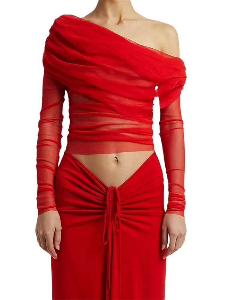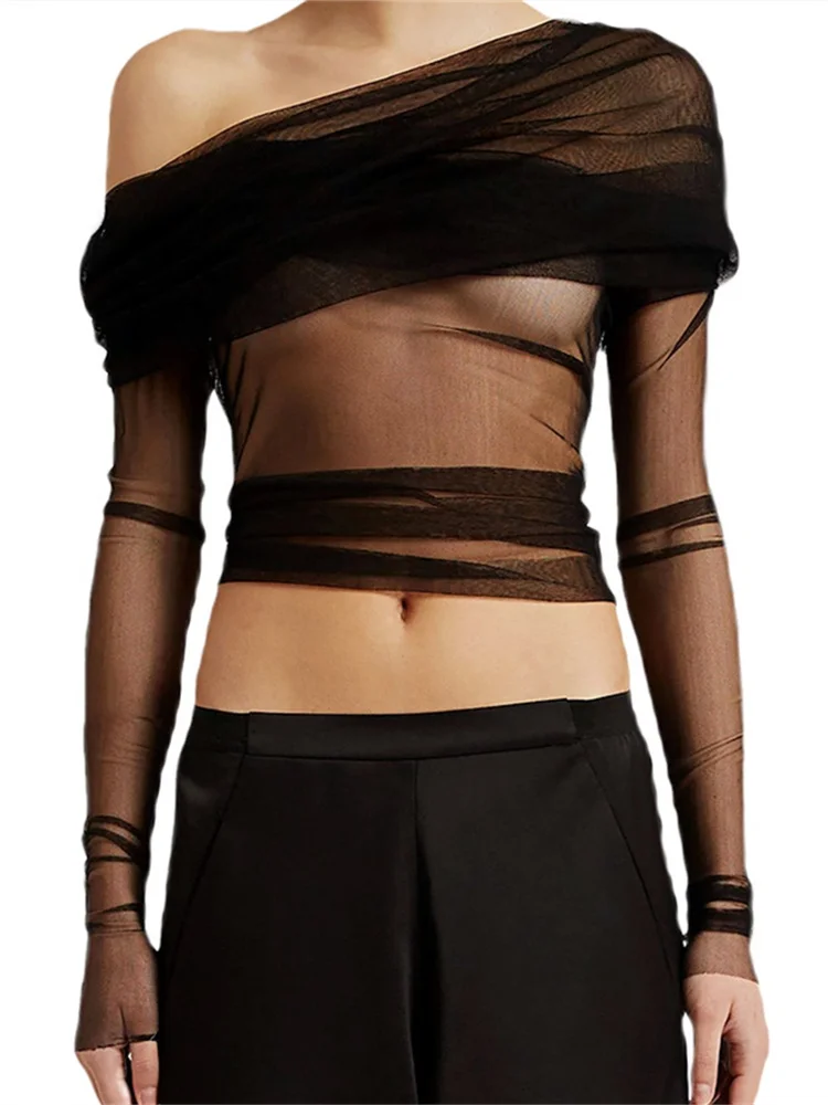 Women Cropped Shirts Long Sleeves Off Shoulder Pleated Tops Casual Elegant Sexy Mesh Sheer Blouse